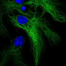 ![]() Células progenitoras neurales (verde) en la rata bulbo olfativo | ||