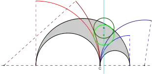 Dos de los infinitos círculos de Woo (negro y verde), que tienen su centro en la recta de Schoch (cian) y son tangentes a sus correspondientes arcos