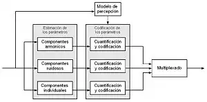 - División del señal en subbandas de frecuencia que se aproximan a las bandas críticas y cuantificar cada subbanda en función de un umbral de detección del ruido dentro de la subbanda. De esta forma se analiza el señal de audio y se calcula la cantidad de ruido (pérdidas inapreciables) que se pueden introducir a cada rango de frecuencias, es decir, el umbral de enmascaramiento.