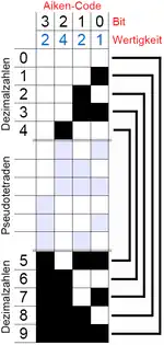 El código Aiken difiere del código BCD estándar 8421 en que el código Aiken no pondera el cuarto dígito con 8 como en el código BCD estándar, sino con 2.