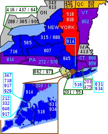 El área azul es el estado de Nueva York; el área roja es el código de área 518