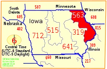 Códigos de área para el estado de Iowa, Estados Unidos, con el código de área 563 en rojo.
