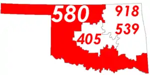 Mapa de Oklahoma con el código de área 580 en rojo.