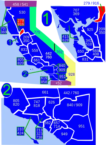 Mapa de los códigos de áreas en California mostrados en azul y en rojo el 916