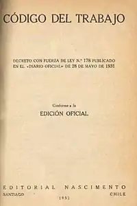 ![]() Portada de la edición del Código del Trabajo de Chile de 1931, de la Editorial Nascimiento (1932) | ||