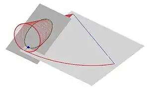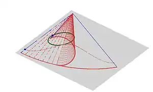 - Considérese una cónica ordinaria dibujada sobre un plano. Envuélvase el plano para formar un cono circular recto, de forma que la cónica se convierta en una curva en el espacio tridimensional. La proyección de la curva en un plano perpendicular al eje del cono será una cónica generalizada en el sentido de Apostol y Mnatsakanian con k < 1.
