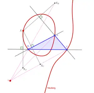 El conjugado isogonal de un punto P respecto de un triángulo △ABC es el punto de concurrencia de las reflexiones de las rectas PA, PB, PC respecto de las bisectrices de A, B, C respectivamente. El conjugado isogonal de P a veces se denota por P*. El conjugado isogonal de P* es P. Una cúbica autoisogonal es una cúbica triangular que es invariante bajo conjugación isogonal. Una cúbica isogonal fundamental es una cúbica en la que los puntos P que se encuentran en la cúbica y sus conjugados isogonales son colineales con un punto fijo Q conocido como punto de pivote de la cúbica. La cúbica de Neuberg es una cúbica isogonal fundamental que tiene su pivote en la intersección de Recta de Euler con line at infinity. En la Enciclopedia de centros de triángulos de Kimberling, este punto se denota por X(30).