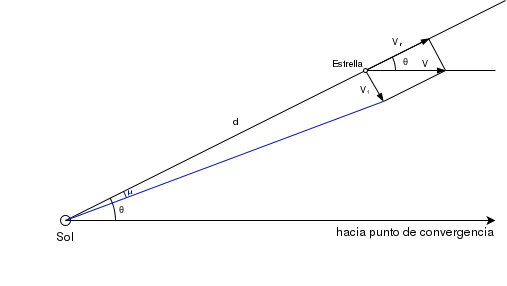 Es decir, la tangente del ángulo que vemos entre la estrella y el punto de convergencia del cúmulo es igual a la relación entre la velocidad tangencial (Vt, la componente de la velocidad en la dirección perpendicular a la línea de visión) y la velocidad radial (Vr, la componente de la velocidad en la dirección de la línea de visión).