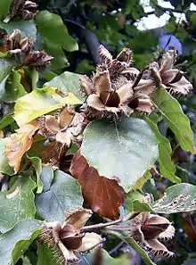 - En la familia Fagaceae, producción de origen axial, acrecida durante el desarrollo del fruto o de la infrutescencia y que los envuelve en mayor o menor grado; acompaña a los aquenios propios de sus representantes. También llamado calibio. Ejemplos: la base de las bellotas de los robles (Quercus), el "erizo" de las castañas (Castanea), el "hayuco" de las hayas (Fagus).