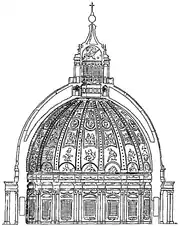 Una cúpula hemiesférica, parabólica o elipsoidal es una figura o lugar de puntos generados a partir de un arco que gira en torno a un eje vertical, denominada en este caso cúpula de revolución.[nota 12]Está formada por piezas llamadas dovelas que se disponen en forma de arco hasta la dovela superior o clave, que equilibra los esfuerzos de manera análoga a un arco o bóveda pero en tres dimensiones. Para permitir la entrada de luz al interior de la cúpula puede abrirse un óculo cenital, acompañado o no de una linterna. Para ello se sustituye la clave por un anillo superior de piezas que resistan los esfuerzos de compresión, en ocasiones realizado en bronce para una mayor estabilidad y durabilidad.[nota 13] Teóricamente, siempre es posible construir una cúpula de revolución, puesto que está constituida por infinitos anillos que se sujetan por sí mismos una vez completados. La técnica constructiva es bastante sencilla: los ladrillos se disponen en anillos circulares concéntricos superpuestos, cuyo diámetro disminuye a medida que se eleva hacia la cúspide. De este modo la estructura es autoportante, es decir, capaz de sujetarse por sí misma.[72]