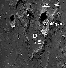 Por convención estos elementos son identificados en los mapas lunares poniendo la letra en el lado del punto medio del cráter que está más cerca deno a C. Mayer. El cráter C Mayer D presenta una silueta que recuerda al mapa de Brasil.[1]