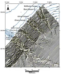 Un cañón submarino es un valle de laderas inclinadas ubicado en el talud continental y cuya formación está a menudo relacionada con un río actual o antiguo en el continente colindante, como si se tratara de una prolongación de ese río precursor. En la mayoría de los casos la plataforma continental cubre una parte de dicho cañón, sobre todo cuando dicha plataforma es bastante extensa y con una pendiente escasa, tal como se ve en el caso de los cañones submarinos al oeste de Los Ángeles. En otras ocasiones, el cañón submarino también corta a la plataforma continental, por lo que llega prácticamente a la desembocadura del río que le dio origen, como es el caso del río Hudson visible en el mapa batimétrico y en el caso del río Congo en el oeste de África. La formación de los cañones submarinos es un proceso geológico que requiere una enorme cantidad de tiempo y que pone de manifiesto la eterna oposición entre los movimientos constructores y destructores del relieve terrestre.
