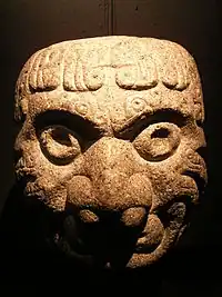 Las cabezas antropomorfas son bastante elaboradas sin dejar de ser gruesas, teniendo los ojos abiertos y la boca cerrada, rugosidades faciales y narices aplastadas, mostrando su dentadura algún caso de excepción. Las cabezas zoomorfas retratan las de los felinos, serpientes y aves de rapiña, siendo notorios los afilados colmillos que afloran de sus mandíbulas y picos. Las cabezas mitológicas, por último, son mezcla de facciones humanas y animales, tienen los labios gruesos y lucen frecuentemente cabelleras formadas por serpientes.[7]