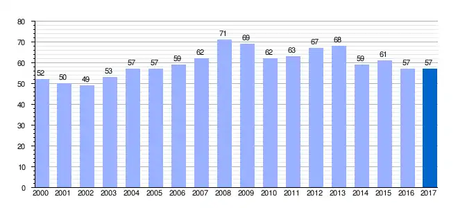 | Gráfica de evolución demográfica de Cabezuela de Salvatierra[6] entre 2000 y 2017 |