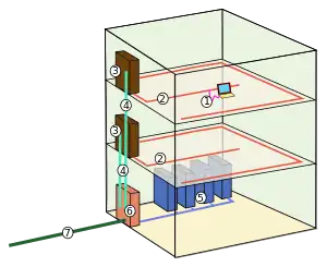 El sistema de cableado vertical proporciona interconexiones entre cuartos de entrada y servicios del edificio, cuartos de equipos y cuartos de telecomunicaciones. El cableado del backbone incluye la conexión vertical (Las canalizaciones Backbone pueden ser verticales u horizontales) entre pisos en edificios de varios pisos. El cableado del backbone incluye medios de transmisión (cables), puntos principales e intermedios de conexión cruzada y terminaciones mecánicas. El cableado vertical realiza la interconexión entre los diferentes gabinetes de telecomunicaciones y entre estos y la sala de equipamiento. En este componente del sistema de cableado ya no resulta económico mantener la estructura general utilizada en el cableado horizontal, sino que es conveniente realizar instalaciones independientes para la telefonía y datos. Esto se ve reforzado por el hecho de que, si fuera necesario sustituir el backbone, ello se realiza con un coste relativamente bajo, y causando muy pocas molestias a los ocupantes del edificio. El backbone telefónico se realiza habitualmente con cable telefónico multipar. Para definir el backbone de datos es necesario tener en cuenta cuál será la disposición física del equipamiento. Normalmente, el tendido físico del backbone se realiza en forma de estrella, es decir, se interconectan los gabinetes con uno que se define como centro de la estrella, en donde se ubica el equipamiento electrónico más complejo.