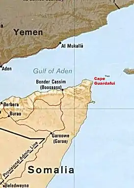 Su orilla, a 51°27'52"E, es el segundo punto más oriental de África continental después del cabo de Ras Hafun, el extremo de la pequeña península de igual nombre.. Su localidad adyacente se llama Ras Asir. El canal Guardafui (Marinka Gardafuul) se llama así por el cabo.