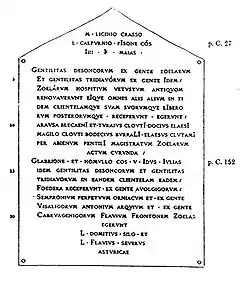 En el consulado de Marco Licinio Crasso y de Lucio Calpurnio Pisón, cuatro días antes de las Calendas de mayo, la gentilitas de los Desoncos de la gens de los Zoelas, y la gentilitas de los Tridiavos, de la misma gens de los Zoelas, renovaron un pacto de hospitalidad antiquísimo y se recibieron mutuamente en su fidelidad y clientela y la de sus hijos y descendientes. Lo realizaron Arausa, hijo de Blecaeno, Turaio, hijo de Cloutio, Docio, hijo de Elaeso, Magilón, hijo de Cloutio, Bodecio, hijo de Burralo, Elaeso hijo de Clutamo, por medio de Abieno, hijo de Pentilo, magistrado de los Zoelas. Hecho en Curunda.Pacto de los Zoelas.[30]