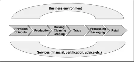 En el corazón del concepto de cadena de valor agrícola está la idea de actores conectados a lo largo de una cadena que producen y entregan bienes a los consumidores a través de una secuencia de actividades.[3] Sin embargo, esta cadena “vertical” no puede funcionar aisladamente y un aspecto importante del enfoque de la cadena de valor es que también considera los impactos “horizontales” en la cadena, como la provisión de insumos y financiamiento, el apoyo de extensión y el entorno propicio general. El enfoque ha resultado útil, especialmente por parte de los donantes, ya que ha dado lugar a una consideración de todos los factores que influyen en la capacidad de los agricultores para acceder a los mercados de forma rentable, lo que ha llevado a una gama más amplia de intervenciones en cadena. Se utiliza tanto para mejorar las cadenas existentes como para que los donantes identifiquen oportunidades de mercado para los pequeños agricultores.[4]