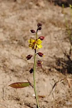 Es un arbusto caducifolio en verano de hasta 1 m de alto, globoso, de ramas erectas, angulosas y glabras. Hojas bipinnati-compuestas, 2-3 pares de pinnas, éstas, a su vez, con 5 a 8 pares de folíolos elípticos, glabros. Las flores se disponen en racimos laxos terminales de 10-15 cm de largo. Cáliz con 5 sépalos de color rojo oscuro; corola con 5 pétalos amarillos, el superior con manchas o líneas rojas; androceo 10 estambres. El fruto es una legumbre 4-6 cm de largo, plana, roja oscura, con glándulas negras, que pasa a café clara al madurar; tiene 2 a 3 semillas acorazonadas; maduran a fines de primavera y comienzos del verano.[2]