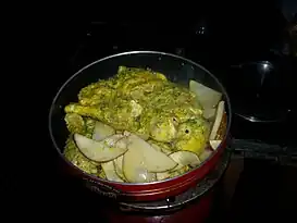 | Ingredientes | Pollo, chile verde, cilantro, cebolla, ajo, jengibre, canela, pimienta, guindilla, macis, clavo en polvo, jugo de lima y vinagre | |