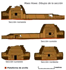 El grupo Maeshowe, llamado así por el famoso monumento de las Orcadas, es uno de los más elaborados. Aparecen relativamente tarde y sólo en las Orcadas[15] y no está claro por qué el uso de los cairn continuó en el norte cuando su construcción había cesado en gran parte en otras partes de Escocia. Consisten en una cámara central desde la que se dirigen pequeños compartimentos en los que se colocan los enterramientos. Las cámaras centrales son altas y empinadas y tienen un techo de falso arco revestido con piedra de alta calidad[26]