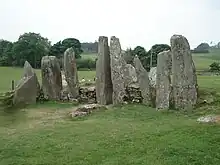 La tumba en sí tiene dos cámaras. La cámara exterior, a la que se entraba por la fachada, contenía un fragmento de un hacha ceremonial de jadeíta, junto con fragmentos de cerámica neolítica y una punta de flecha en forma de hoja. El ajuar funerario tardío comprendía vasos de cerámica de Peterborough y del vaso campaniforme y un cuchillo de pedernal. La cámara interior estaba construida como una caja cerrada y era inaccesible desde la exterior.[3] Probablemente originalmente estaba techado por una gran losa de piedra que descansaba sobre las dos losas del extremo más altas. La cámara interior contenía una cista secundaria, con vasos de alimentos y una piedra tallada en forma de copa y anillo.