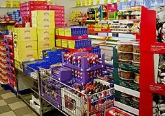 - Exposición informal. Con el fin de agilizar las tareas de manipulación, encontramos frecuentemente en los supermercados embalajes expuestos que no fueron concebidos para tal fin. Así ocurre con aquellos que se rasgan con cúter o con cinta de rasgado dejando al producto sobresalir por la parte superior. Los mensajes de la caja se corresponden a un embalaje de transporte (código de barras, n.º de unidades, peso, etc.) y no a uno promocional (características, mensajes publicitarios, etc.) por lo que la impresión general resulta muy pobre. Se suele dar en bebidas, lejías, aceites, leche y otros productos de bajo valor añadido.