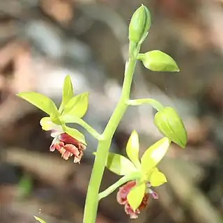 Es una orquídea de tamaño pequeño a mediano, con creciente hábito terrestre con cortos pseudobulbos ovoides que llevan 2-3 hojas, unidas en una vaina basal, plegadas, elípticas a lanceoladas elípticas, agudas, pecioladas o sésiles en base. Florece en la primavera en una inflorescencia erecta de 30 a 50 cm de largo, con 8 a 12 flores poco pubescentes, surgidas de un pseudobulbo de reciente desarrollo y con brácteas lanceoladas que cubren la mitad del ovario pubescente.[1]