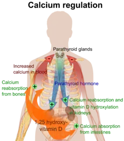 Los niveles de calcio en plasma en los mamíferos están estrictamente regulados,[1][2] y el hueso actúa como el principal sitio de almacenamiento de minerales. Los iones de calcio, Ca2+, se liberan del hueso al torrente sanguíneo en condiciones controladas. El calcio se transporta a través del torrente sanguíneo en forma de iones disueltos o se une a proteínas como la albúmina sérica. La hormona paratiroidea secretada por la glándula paratiroidea regula la reabsorción de Ca2+ del hueso, la reabsorción en el riñón de regreso a la circulación y aumenta la activación de la vitamina D3 a calcitriol. El calcitriol, la forma activa de la vitamina D3, promueve la absorción de calcio de los intestinos y los huesos. La calcitonina secretada por las células parafoliculares de la glándula tiroides también afecta los niveles de calcio al oponerse a la hormona paratiroidea; sin embargo, su importancia fisiológica en los seres humanos es dudosa.