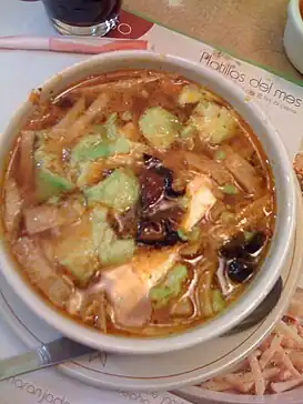 ![]() Caldo tlalpeño con arroz rojo y tortillas. | ||
