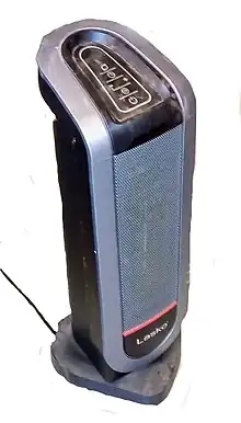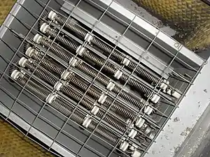 La calefacción eléctrica es un proceso en el que la energía eléctrica se convierte en energía térmica. Un calentador eléctrico es un dispositivo eléctrico que convierte una corriente eléctrica en calor.[1] Las aplicaciones comunes incluyen calefacción de espacios, cocina, calentamiento de agua y procesos industriales.[1] El elemento calefactor dentro de cada calentador eléctrico es una resistencia eléctrica y funciona según el principio de efecto Joule: una corriente eléctrica que pasa a través de una resistencia convertirá esa energía eléctrica en energía térmica. La Mayoría de los dispositivos de calefacción eléctricos modernos utilizan alambre de nicromo como elemento activo; el dispositivo calefactor, que se muestra a la derecha, utiliza alambre de nicromo sostenido por aisladores cerámicos.