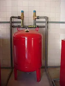 - Vaso de expansión.- El calentamiento del agua, supone, además de un aumento de temperatura, un aumento de volumen. Teniendo en cuenta que la instalación de calefacción es un sistema cerrado, es necesario proveer a la misma de un sistema que acoja el aumento de volumen en la fase de calentamiento, manteniendo la presión por debajo de la máxima de seguridad e impidiendo la entrada de aire en la de enfriamiento. Está, por tanto, prohibido el vaso de expansión abierto,salvo casos muy especiales,[13] incluso para las calderas de combustible sólido.