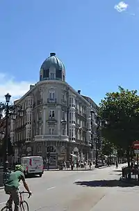 Situado en el número 20 de la calle, el edificio que albergó en sus bajos hasta el año 1980 el cine Aramo,[11] es uno de las más importantes obras del funcionalismo en Asturias. Su primer proyecto data de 1935, compartido por los arquitectos Enrique Rodríguez Bustelo y los Hermanos Somolinos. La Guerra Civil interrumpe las obras, presentándose en 1939 un nuevo proyecto continuador del anterior y exclusivo de Somolimos. En sus orígenes se trataba de un edificio destinado a viviendas, de lujo, con destino al alquiler, con una sala de cine y un local comercial en la planta baja. El entresuelo estaba destinado a oficinas del promotor y el ático a estudio de los arquitectos Somolinos, Francisco y Fernando. El edificio se terminó en 1941, abriendo sus puertas el cine Aramo en 1944. En el año 2001, el local comercial, ocupado anteriormente por Radio Norte, y la sala del cine son reformados para albergar una superficie comercial.[12]