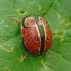 - Bugguide.net. Calligrapha spiraeae Consultado el 22 de enero de 2022.