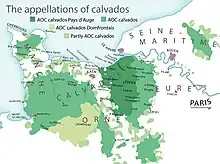 El calvados es un aguardiente con Appellation d'origine contrôlée o AOC (Denominación de Origen Controlada), que se obtiene por destilación de la sidra y es producido exclusivamente en la región de Normandía, Francia.