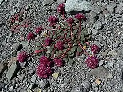 Es una hierba perenne que forma generalmente dos o más rosetas basales de hojas gruesas en forma de cuchara, cada una de unos pocos centímetros de largo. La inflorescencia surge de la roseta, una umbela densa y esférica de sépalos redondeados y cuatro pequeños pétalos.
