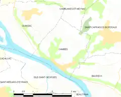 Cambes está situado en Entre-deux-Mers, al borde del Garona -sobre la orilla norte- a 19 km por encima de Burdeos.