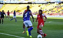 ![]() Camila García en un juego amistoso enfrentando a Santa Fe en el año 2019 donde era la 9 del equipo. | ||