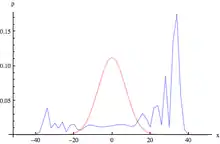 Si en este punto se mide el espín, se obtendría el estado hacia arriba en la posición 1 o un espín hacia abajo en la posición -1, y repetir el procedimiento correspondería a una caminata clásica como, por ejemplo, el tablero de Galton. En cambio, la idea de la caminata cuántica es que no se mide el estado en este punto (y por lo tanto no se fuerza el colapso de la función de onda) sino que se repite el procedimiento de girar el espín y saltar condicionalmente sin medir con antelación. De esta forma, las correlaciones cuánticas (es decir, la función de onda no colapsada) se conservan y diferentes posiciones pueden interferir. Esto proporciona una distribución de probabilidad drásticamente diferente en comparación con la distribución Gaussiana de la caminata clásica como se ve en la figura de la derecha. En términos espaciales, uno ve que la distribución no es simétrica: aunque la moneda de Hadamard da un giro hacia arriba y hacia abajo con la misma probabilidad, la distribución tiende a desplazarse hacia la derecha cuando el giro inicial es un giro ascendente. Este efecto es, en términos generales, debido al hecho de que la moneda de Hadamard da una interferencia más destructiva de las posiciones para los caminos que van a la izquierda que para los caminos que van a la derecha. Se puede obtener una distribución simétrica cuando se usa algún otro operador o cuando se usa un estado de entrada como porque la moneda de Hadamard no introduce números complejos, por lo que el espín arriba y abajo de este estado no se mezclan.
