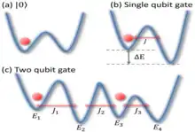 Las caminatas cuánticas permiten describir el comportamiento de un cúbit en computación cuántica. En una red unidimensional, un cúbit está definido por un sistema cuántico, cuya función de onda es el caminante, con dos estados propios. Un ejemplo de este sistema puede ser un bosón, el cual es el caminante, confinado en dos pozos de potencial, donde los estados y representan a la partícula en el pozo de la izquierda y derecha respectivamente. Una sola partícula cuántica puede ocupar los dos sitios en una superposición, codificando un qubit sin la necesidad de grados adicionales de libertad. De esta forma, se puede realizar un sistema de n qubits en una dimensión utilizando n bosones y N = 2n pozos, con un bosón en los dos primeros sitios (que representa el primer qubit), un bosón en los dos sitios siguientes (que representa el segundo qubit), y así sucesivamente.