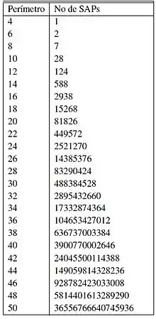 En la serie presentada en la tabla 3 se puede observar la manera en la que aumenta el número de SAPs con perímetro dado sobre la rejilla cuadrada (El perímetro es siempre par a menos que se considere otra rejilla regular como la triangular o la hexagonal).
