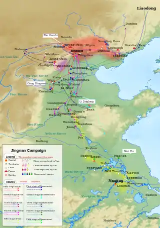 En el invierno de 1401, Zhu Di decidió alterar la estrategia ofensiva general. Las fuerzas de Yan debían saltar los bastiones de las fuerzas del gobierno, y avanzar directamente al sur hacia el río Yangtze.[130][131]