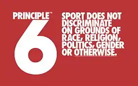 Principio 6 se refiere al sexto principio de la Carta Olímpica que dice que “cualquier forma de discriminación con respecto a un país o una persona por motivos de raza, religión, política, de género o de otro tipo es incompatible con la pertenencia al Movimiento Olímpico.[1]