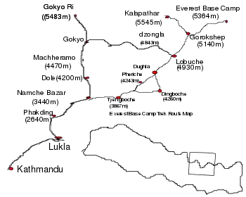 La caminata al campamento base del Everest en el lado sur es una de las rutas más populares de senderismo en el Himalaya y es visitada por cientos de senderistas todos los años. Normalmente los senderistas toman un vuelo de Katmandú a Lukla para ahorrar tiempo y energía antes de iniciar el viaje matutino al campamento base. Aunque es posible llegar a pie a Lukla, ya que no hay carreteras de Katmandú a Lukla, el único medio para transportar suministros grandes y pesados es solo por avión.