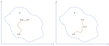 Elijamos el camino mostrado a la izquierda de la figura de la derecha donde se utiliza un sistema de coordenadas cartesianas bidimensional. El segundo segmento de esta trayectoria es paralelo al eje por lo que no hay cambio a lo largo del eje . La integral de línea a lo largo de esta trayectoria es