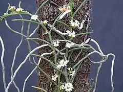 Es una orquídea de hábitos epífitas, monopodial con tallo muy ramificado y hojas cilíndricas alargadas, cuyas inflorescencias brotan de la base del tallo en el nodo opuesto de la hoja. Las flores son pequeñas, blancas, los sépalos y pétalos libres, y nectario en la parte posterior del labio. Pertenece a la especie de la sección Campylocentrum con largas y robustas hojas cilíndricas.[1]