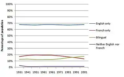 Según el censo realizado en Canadá entre el 2 de mayo y el 31 de julio de 2011,[2] 21.457.080 canadienses hablaban el idioma inglés de forma nativa, equivalentes a un 64,78% de una cantidad total de hablantes de 33.121.175 habitantes. Esta cantidad más que triplicaba a los 6.827.860 francófonos nativos, que entonces correspondían a un 20,61%.[3]