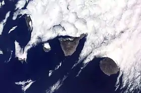 ![]() Vista de satélite. La isla de Tenerife aparece en el centro y Gran Canaria a la derecha. El canal aparece parcialmente cubierto de nubes. | ||