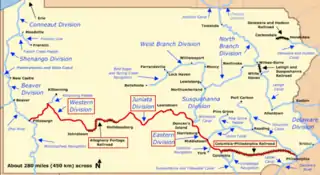El tramo de 395 millas (aproximadamente 636 km.) de la Línea Principal de Obras Públicas estaba dividido en cinco partes: el Ferrocarril de Filadelfia y de Columbia (P&CR), el Canal de la División Este, el Canal de la División Juniata, el Ferrocarril Allegheny Portage y ewl Canal de la División Oeste.