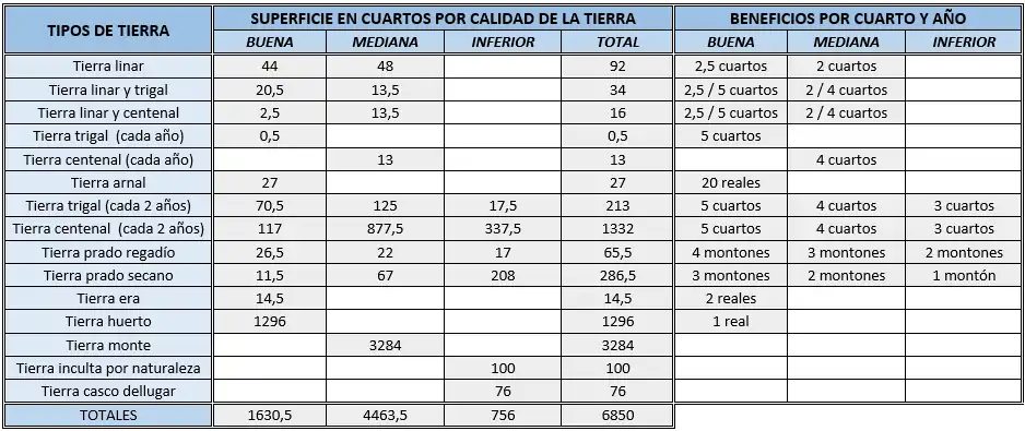 La cantidad de producto utilizado por cuarto de tierra cultivado era la siguiente: En cada cuarto de tierra trigal y centenal de buena calidad se sembraba un cuarto de trigo o centeno, en la de mediana calidad 5 celemines, y en la de calidad inferior 4 celemines. En cada cuarto de tierra linaza se empleaban 9 celemines de grano, y por cada cuarto de tierra linar 2 cuartos de lino. El valor de cada procucto en reales de vellón era el siguiente: Cuarto de trigo (6 reales), cuarto de centeno (5 reales), cuarto de cebada (4 reales), cuarto de linaza (15 reales), montón de hierba (4 reales), libra de lino (1,5 reales), libra de cera (8 reales), libra de queso (1 real), azumbre de miel (4 reales), un pavo (6 reales), y un pollo (0,5 reales).